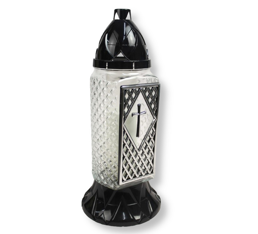 Znicz szklany Z 400 RAMKA 35 cm czarny srebrna aplikacja krzyż - 1 szt