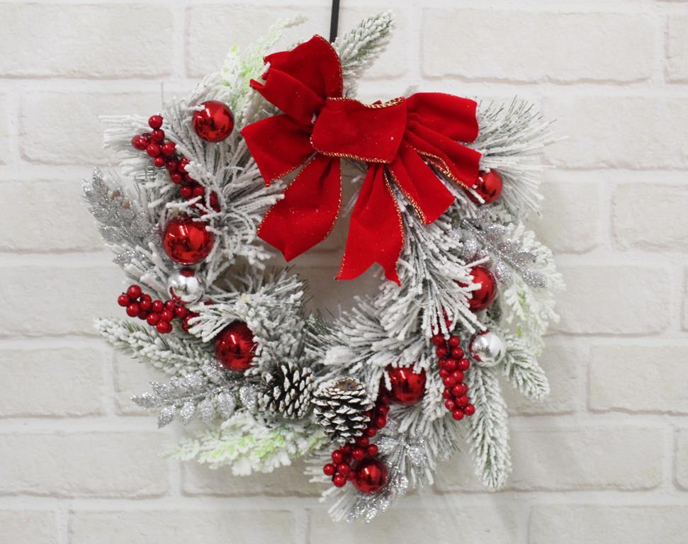 Wianek świąteczny z kokardą i bombkami 35 cm SREBRNO CZERWONY