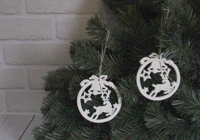 Zawieszka drewniana świąteczna biała BOMBKA z reniferem 9 cm - kpl 2 szt