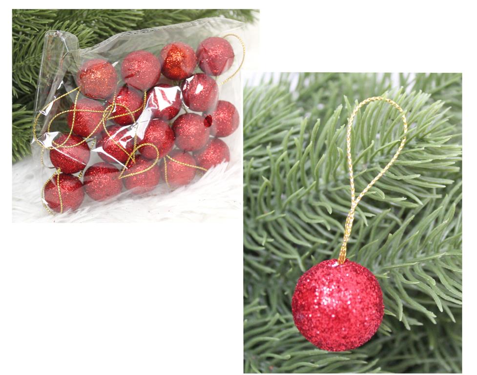 Produkt zawiera 12 szt. bombek styropianowych w brokacie, na drucie. Wymiary bombki: 2,5 cm
