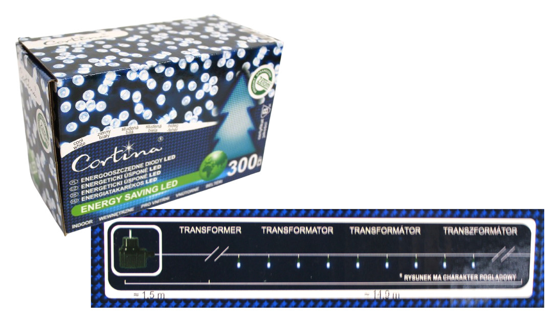 Lampki LED 300L wewnętrzne, transformator 14,9m - ZIMNY BIAŁY