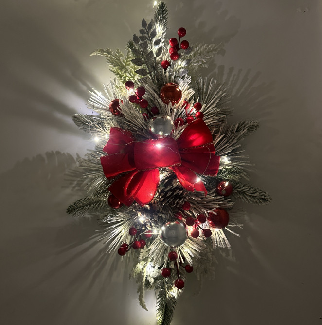 Stroik świąteczny z kokardą i bombkami, świecący 60x30 cm SREBRNO CZERWONY