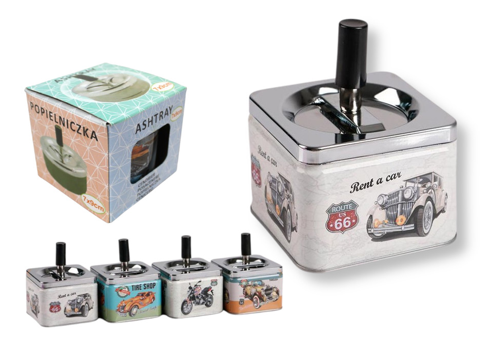 Popielniczka OBROTOWA metalowa okrągła 12x9x7 cm MIX WZORÓW RETRO AUTA