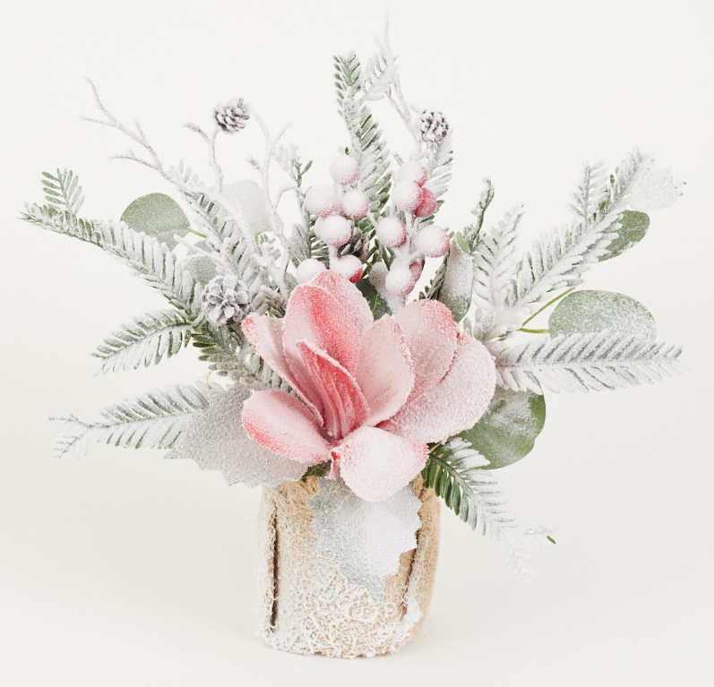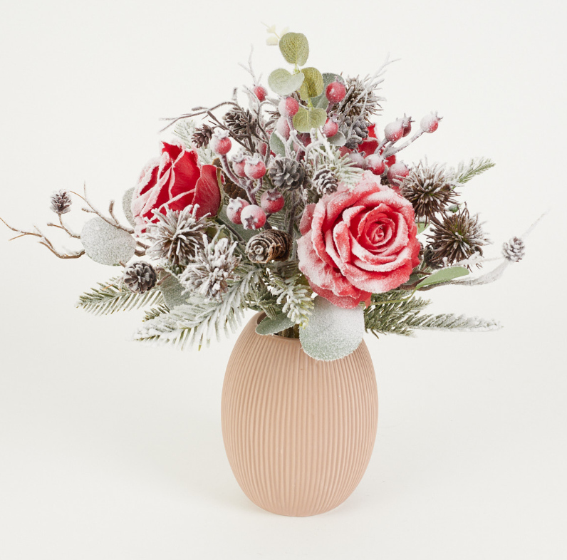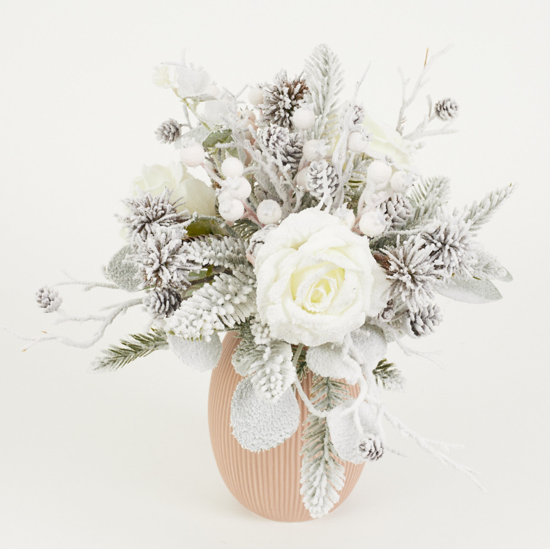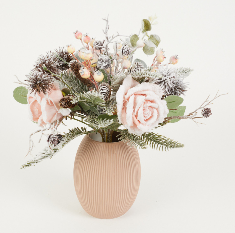 Bukiet świąteczny, mieszany Z RÓŻĄ PUDROWY RÓŻ wys. 38 cm, 7 łodyg (3 kwiaty 9x5 cm) posypany śniegiem