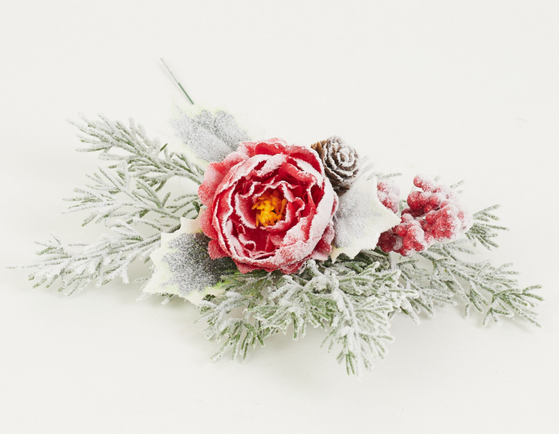 Gałązka świąteczna z PIWONIĄ  czerwoną 30 cm posypana śniegiem