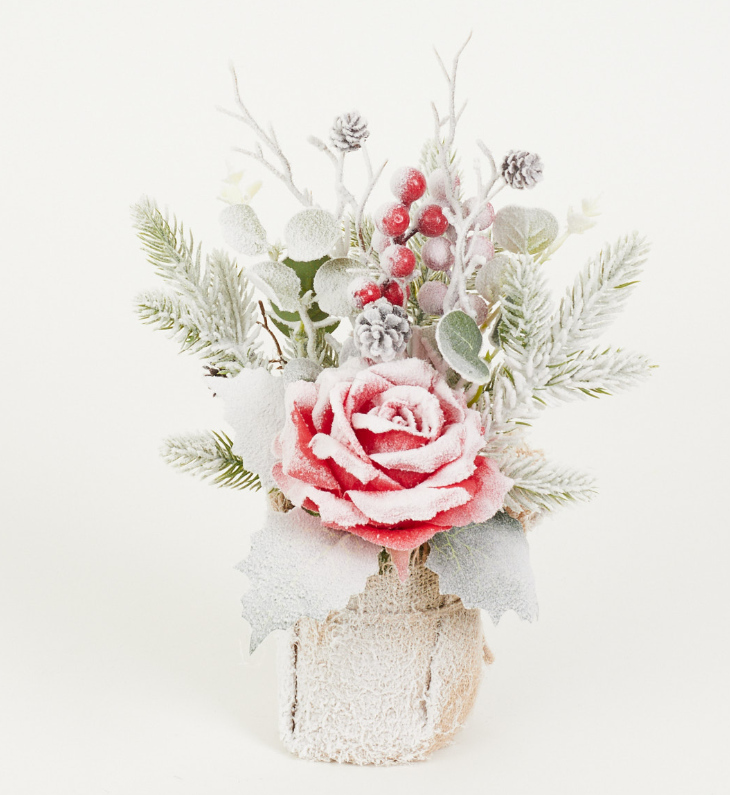 Bukiet świąteczny, mieszany Z RÓŻĄ CZERWONĄ wys. 38 cm, 7 łodyg (3 kwiaty 9x5 cm) posypany śniegiem