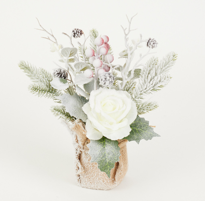 Stroik świąteczny w jucie z RÓŻĄ BIAŁĄ 30 cm posypany śniegiem