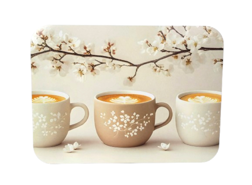Mata stołowa 40x30 cm FILIŻANKI Z KAWĄ UDEKOROWANE SERCEM I GAŁĄZKĄ JAŚMINU