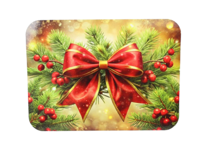 Mata stołowa 40x30 cm STROIK ŚWIĄTECZNY Z CZERWONĄ KOKARDĄ, ŚWIERKIEM, KULKAMI