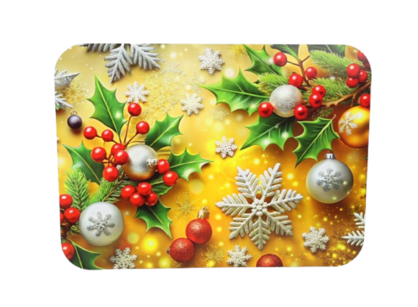 Mata stołowa 40x30 cm ŚWIĄTECZNE STROIKI Z BOMBKĄ, PŁATKI ŚNIEGU NA ZŁOTYM TLE
