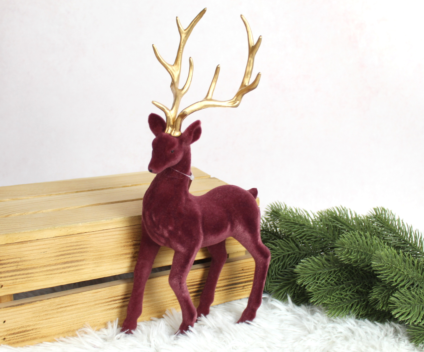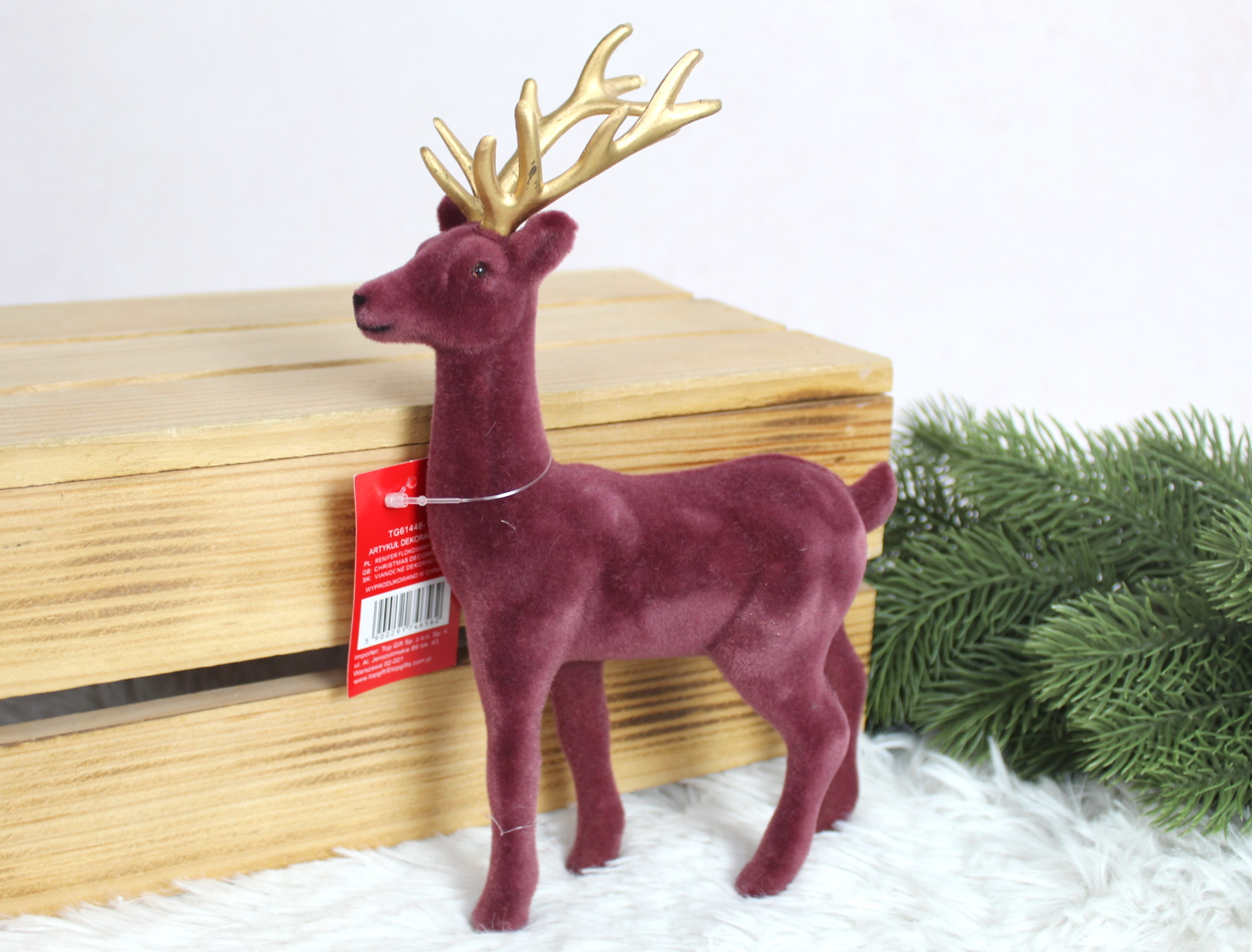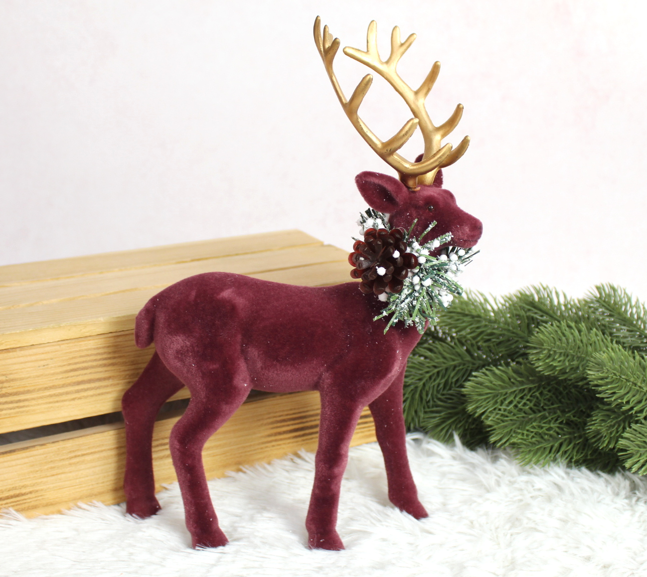 Renifer plastikowy, flokowany ze stroikiem z szyszką 31x20x8 cm - BORDOWY