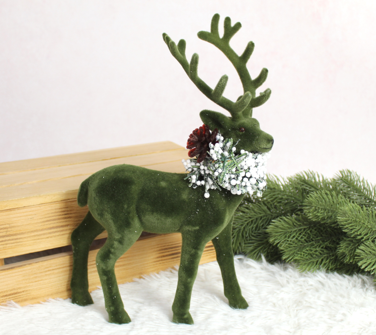 Renifer plastikowy, flokowany ze stroikiem z szyszką 31x20x8 cm - ZIELONY