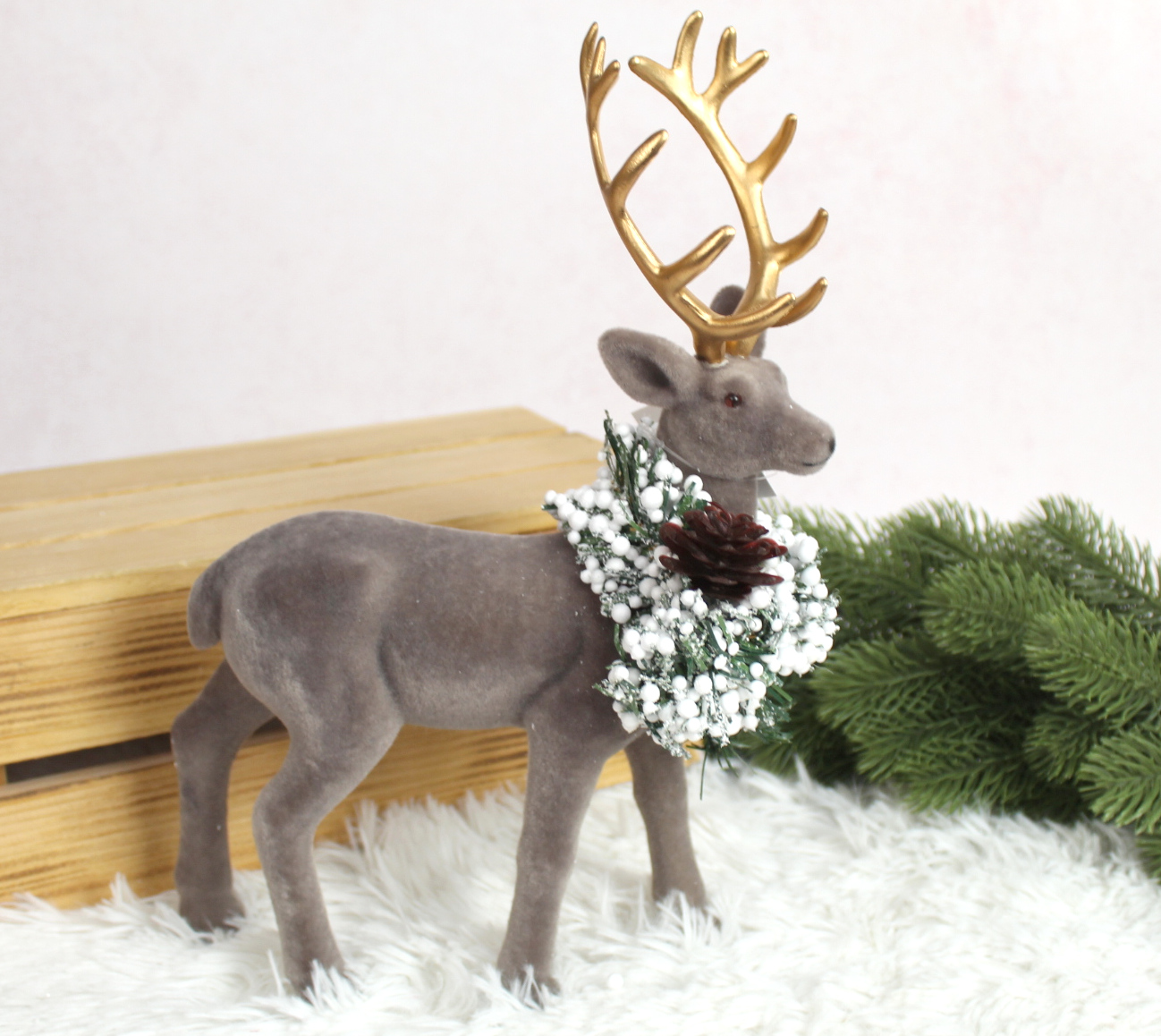 Renifer plastikowy, flokowany ze stroikiem z szyszką 31x20x8 cm - SZARY