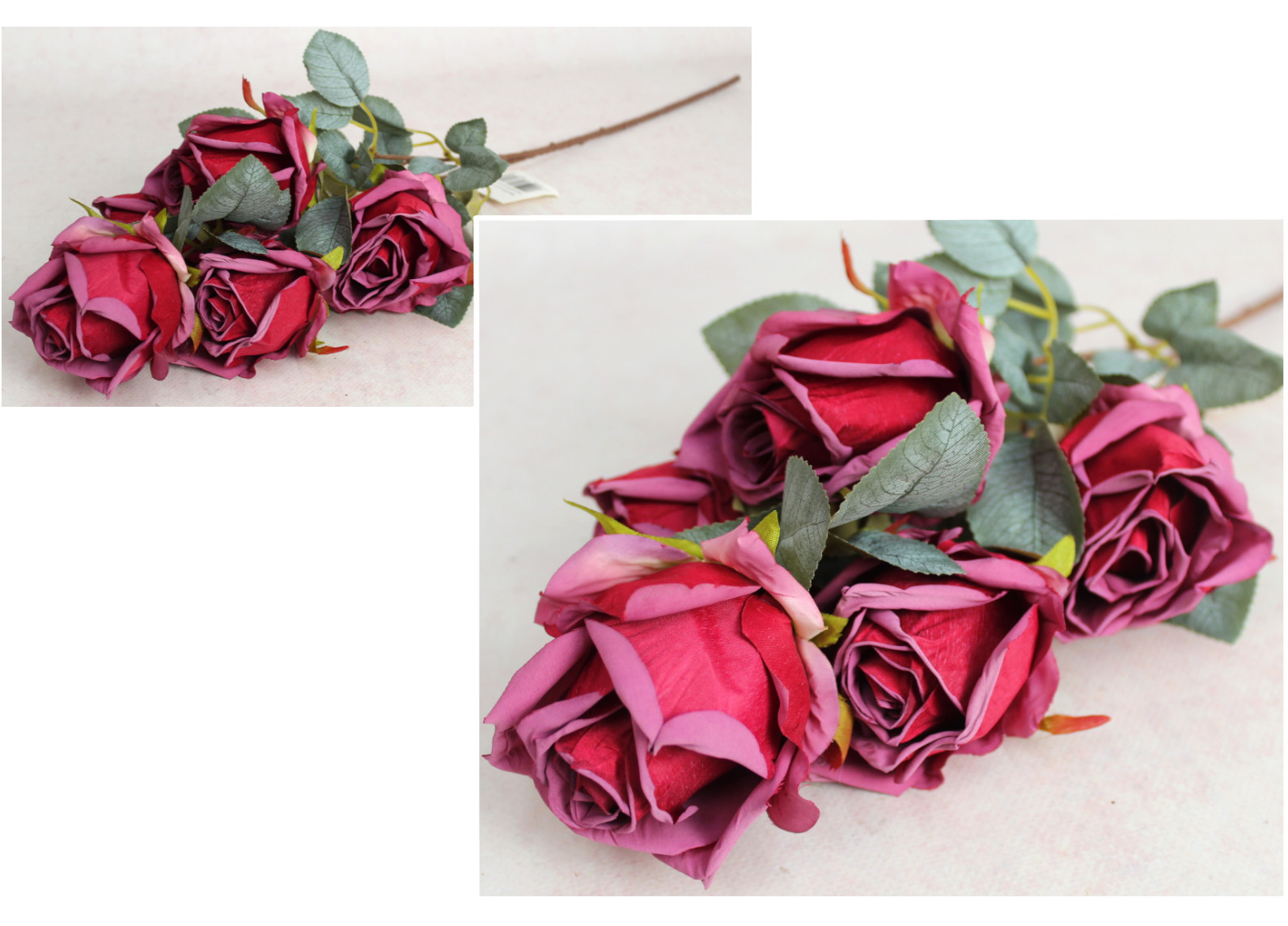 Kwiat RÓŻA wys. 62 cm (5 kwiatów 4x6,5 cm) szary liść RÓŻOWA CIEMNA