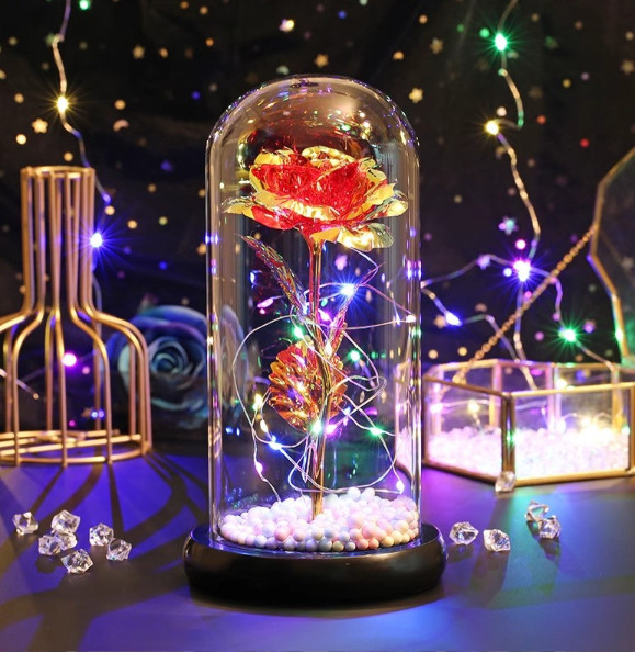 Róża w szkle ŚWIECĄCA czerwono złota na czarnym podstawku 15,5x8,5 cm