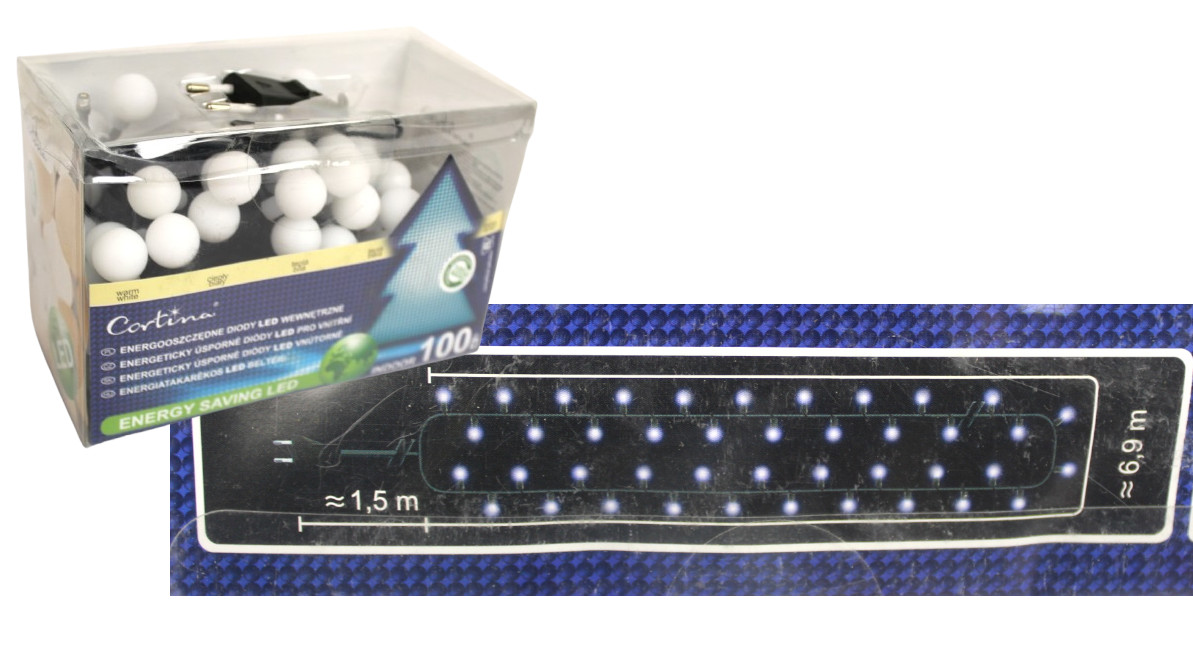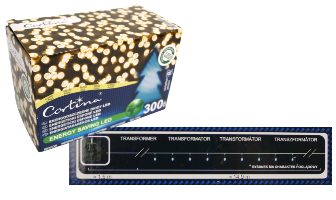 Lampki LED 300L wewnętrzne, transformator 14,9m - CIEPŁY BIAŁY