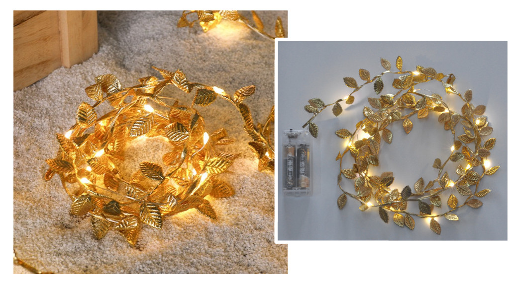 Dekoracja lampki 20 LED złote LISTKI białe ciepłe 2m