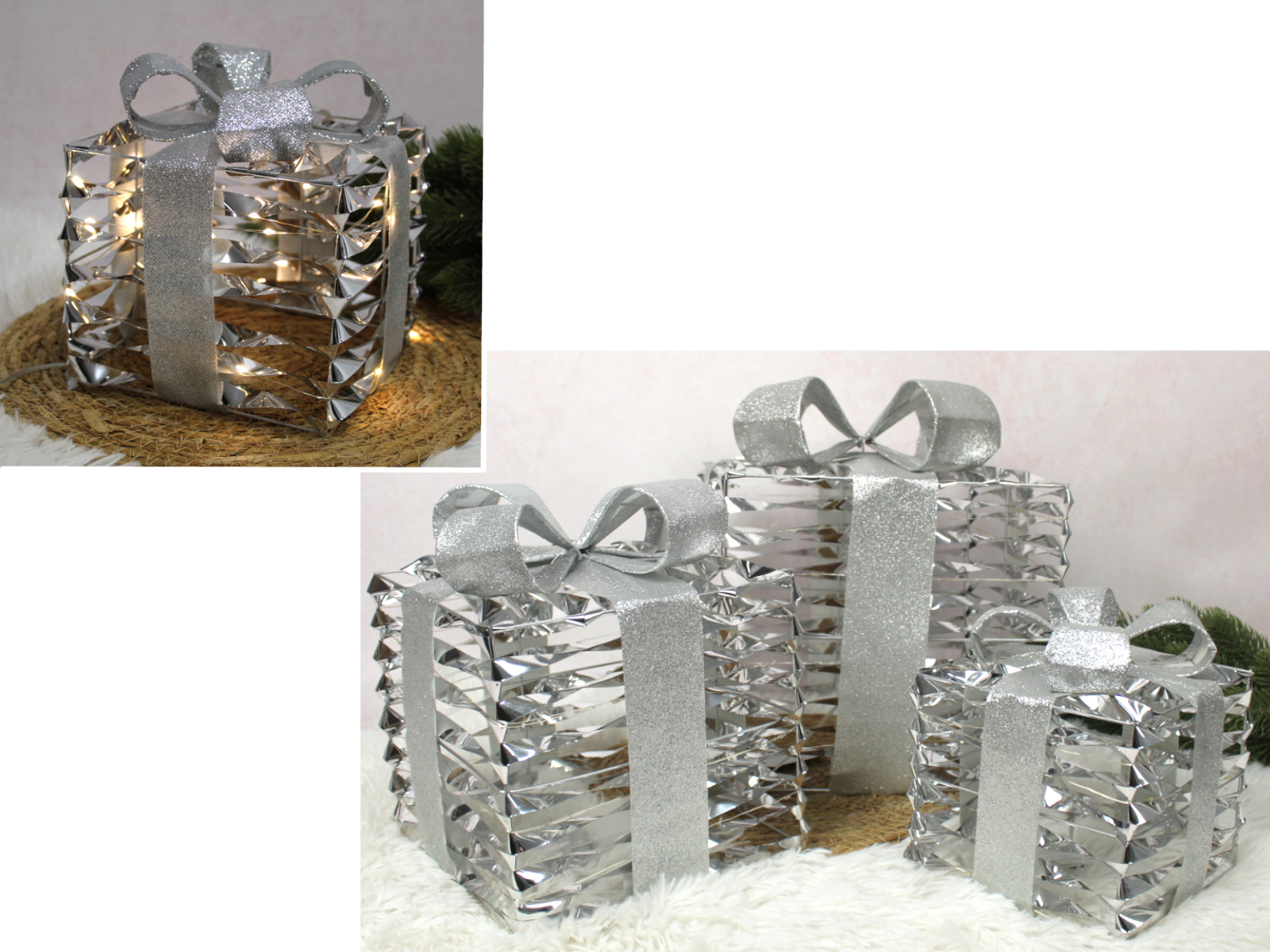 Dekoracja PREZENT LED na stelażu z drutu z folią srebrną KOKARDA kpl 3 szt
