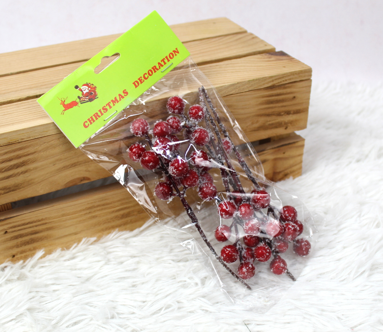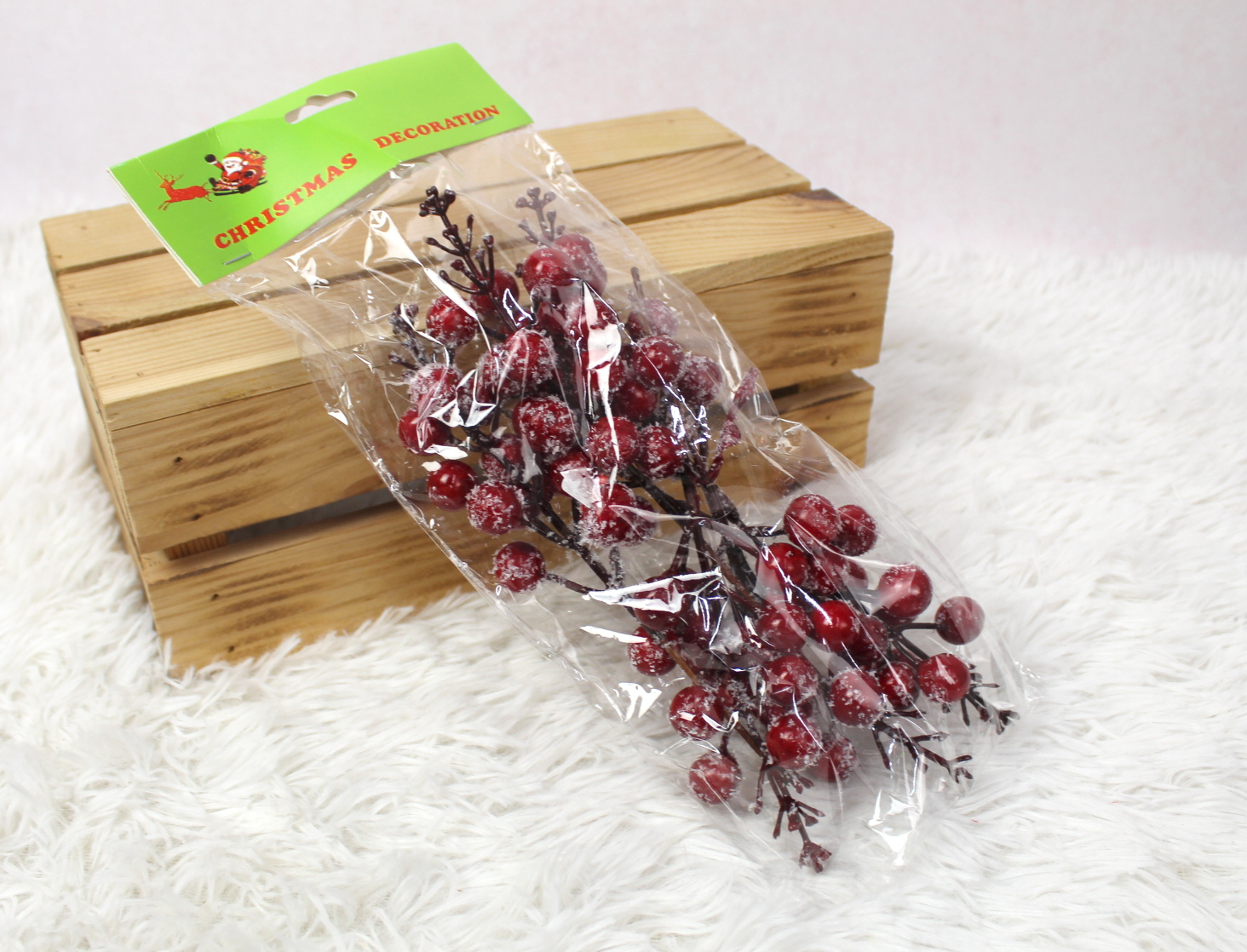 Gałązka dekoracyjna wys. 15 cm CZERWONE KULKI posypane śniegiem kpl 6 szt w folii