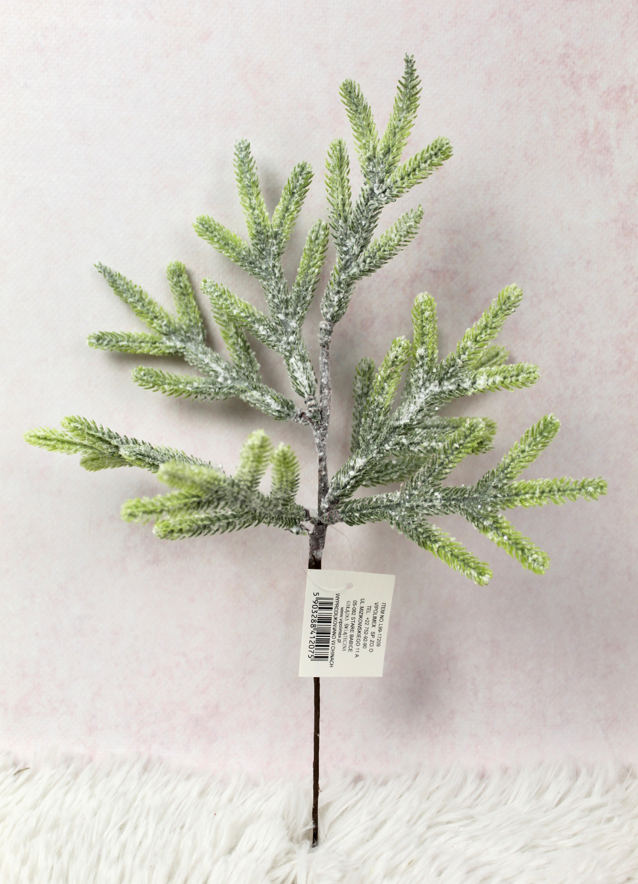 Gałązka świąteczna ŚWIERK drobny wys. 35 cm, 8 łodyg ZIELONY posypany śniegiem