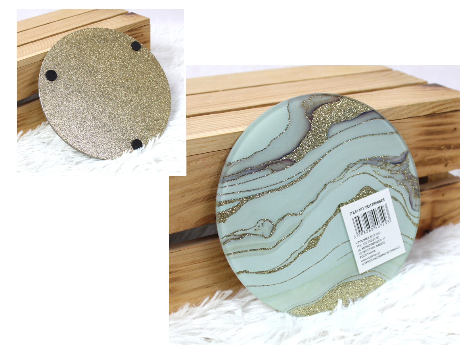 Podstawka szklana okrągła MARMUR 15 cm zielono-złota brokacona