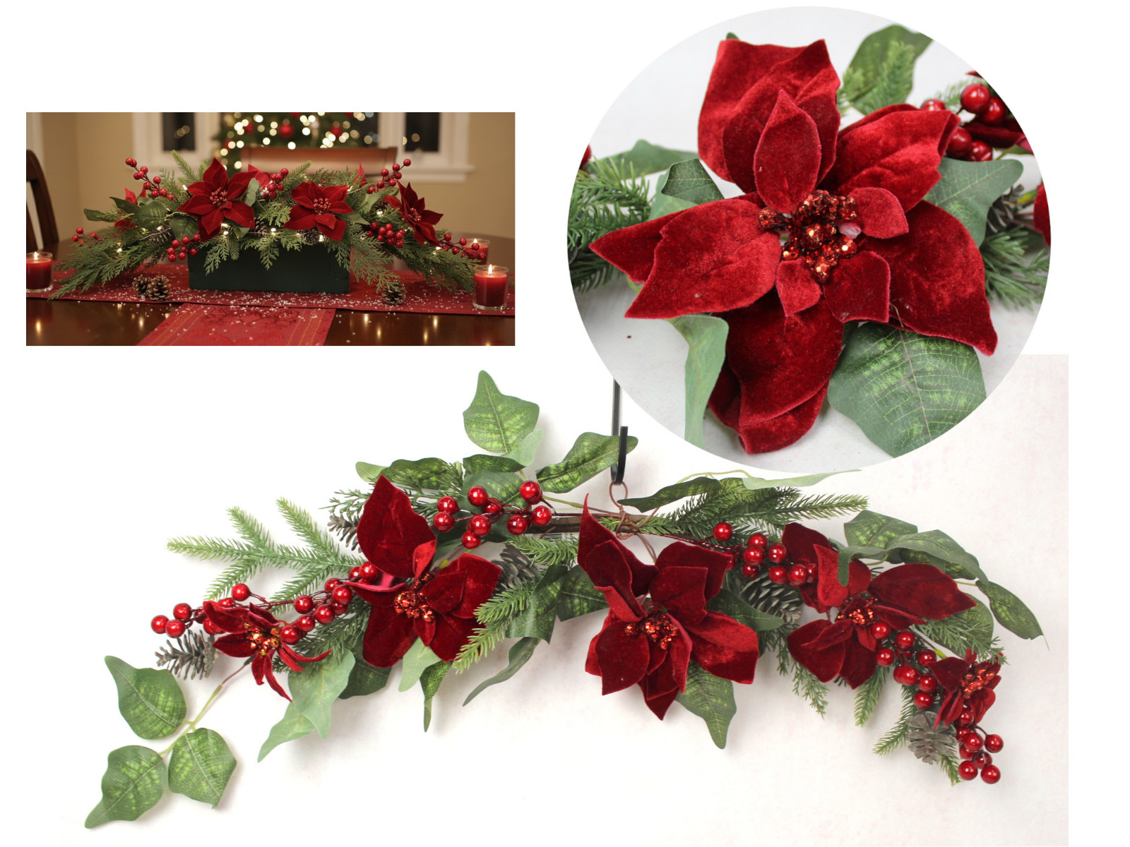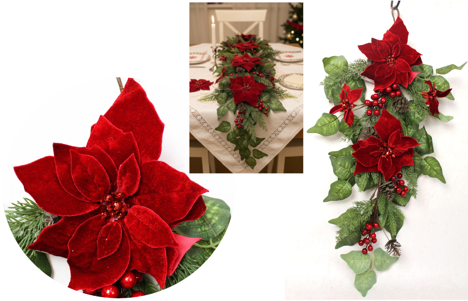 Stroik Gwiazda betlejemska, POINSECJA welurowa (5 kwiatów 12-20 cm) z szyszkami i gałązkami sosny CZERWONY 75 cm