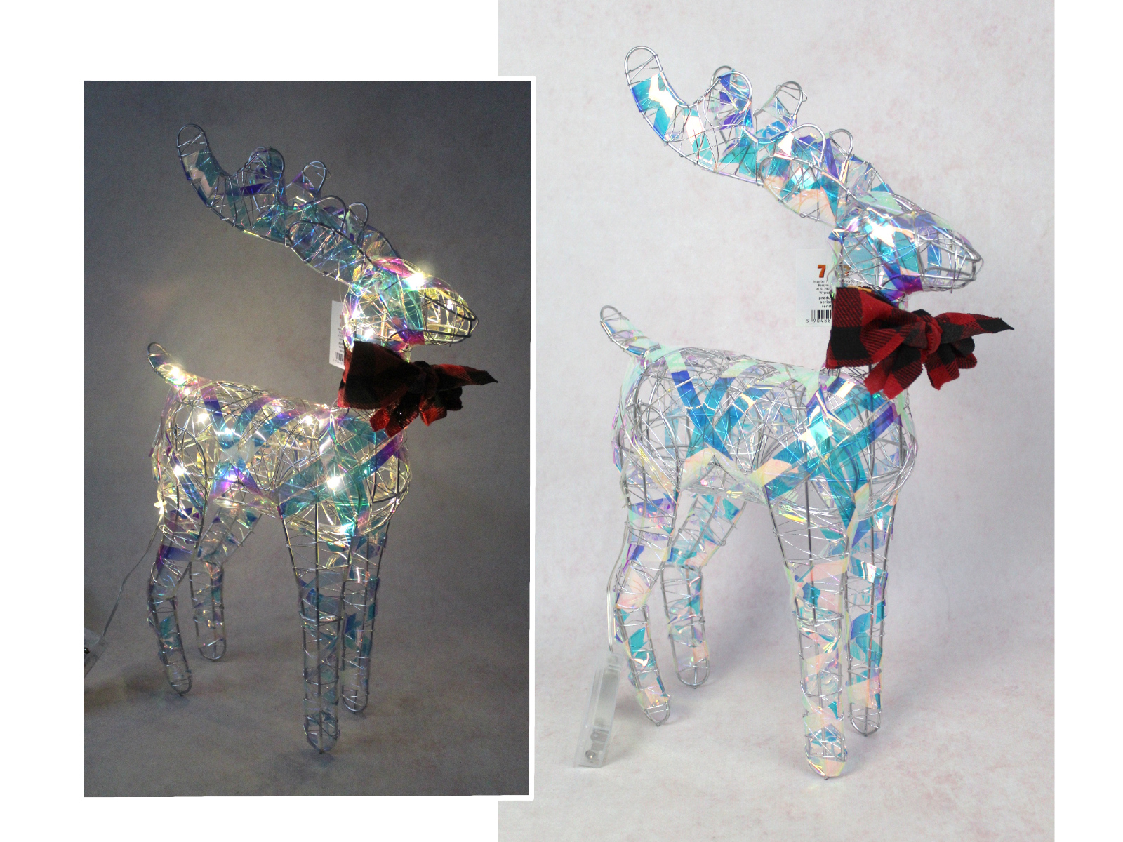Dekoracja na stelażu z drutu z folią holograficzną RENIFER z kokardą 20 LED 44x27x10 cm