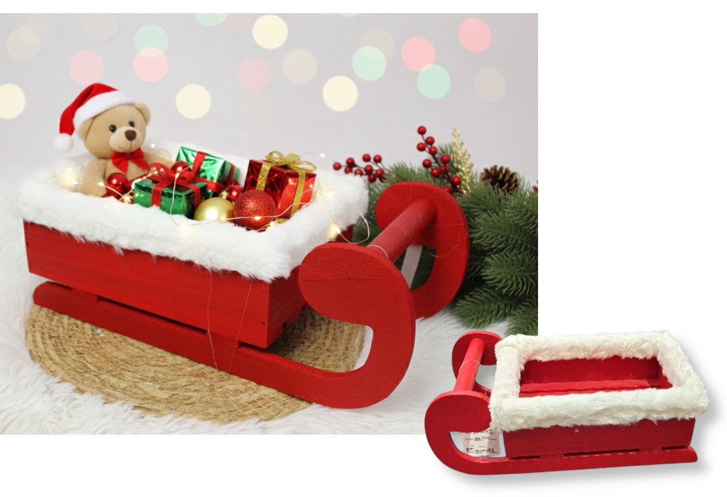 Dekoracja świąteczna SANIE drewniane z futerkiem CZERWONE 35x17x13 cm