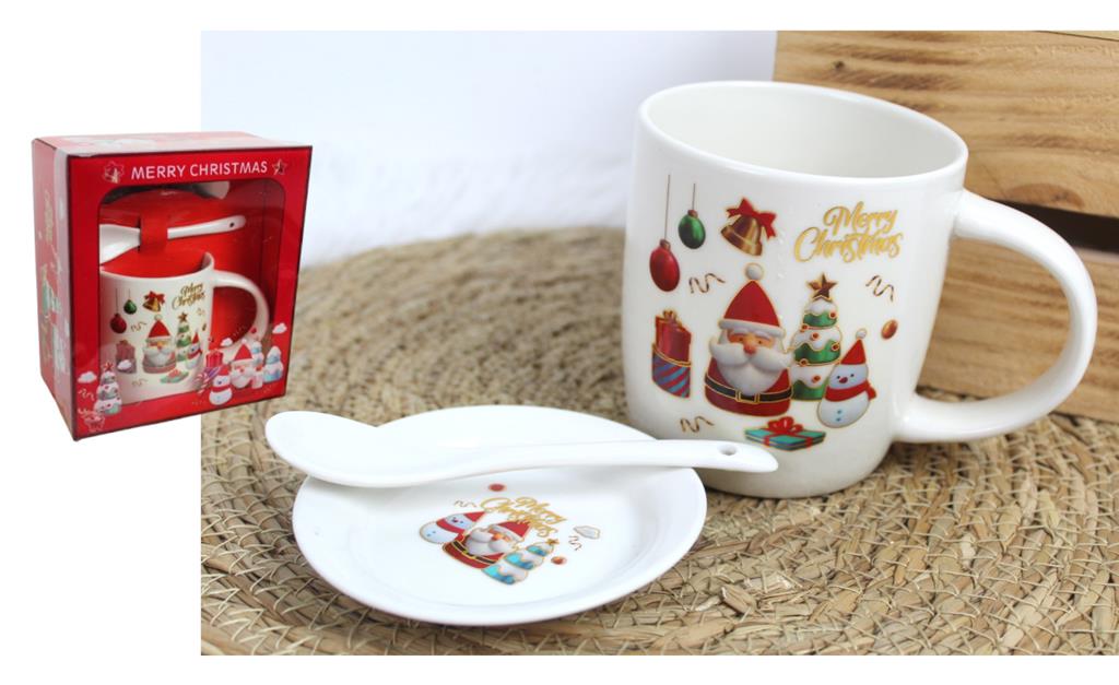 Kubek ceramiczny z łyżką i podstawkiem ŚWIĄTECZNY w kartoniku 17x15x9 cm MIX WZORÓW