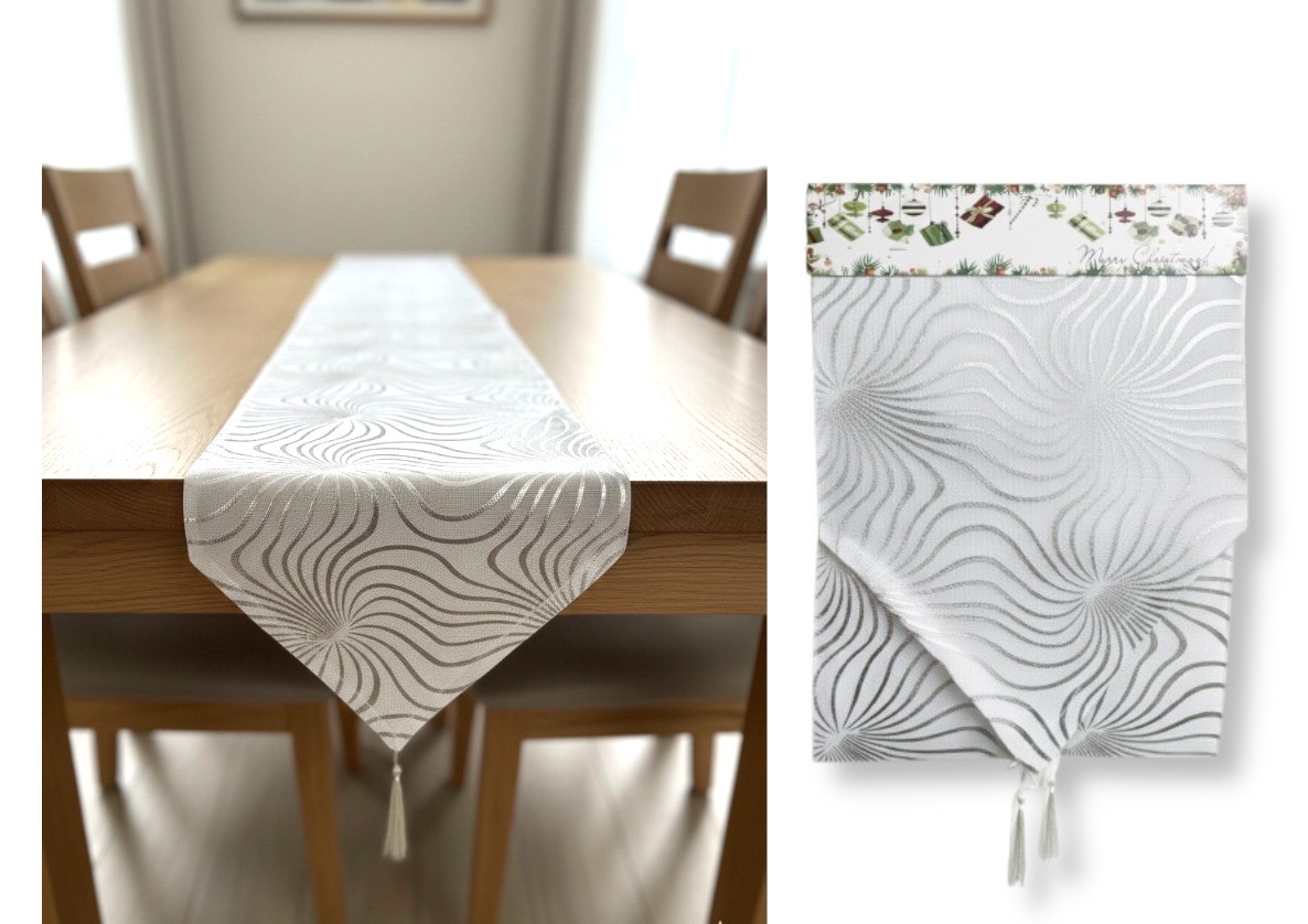 Bieżnik, szarfa na stół świąteczny, bożonarodzeniowy FALE 180x35 cm SREBRNY
