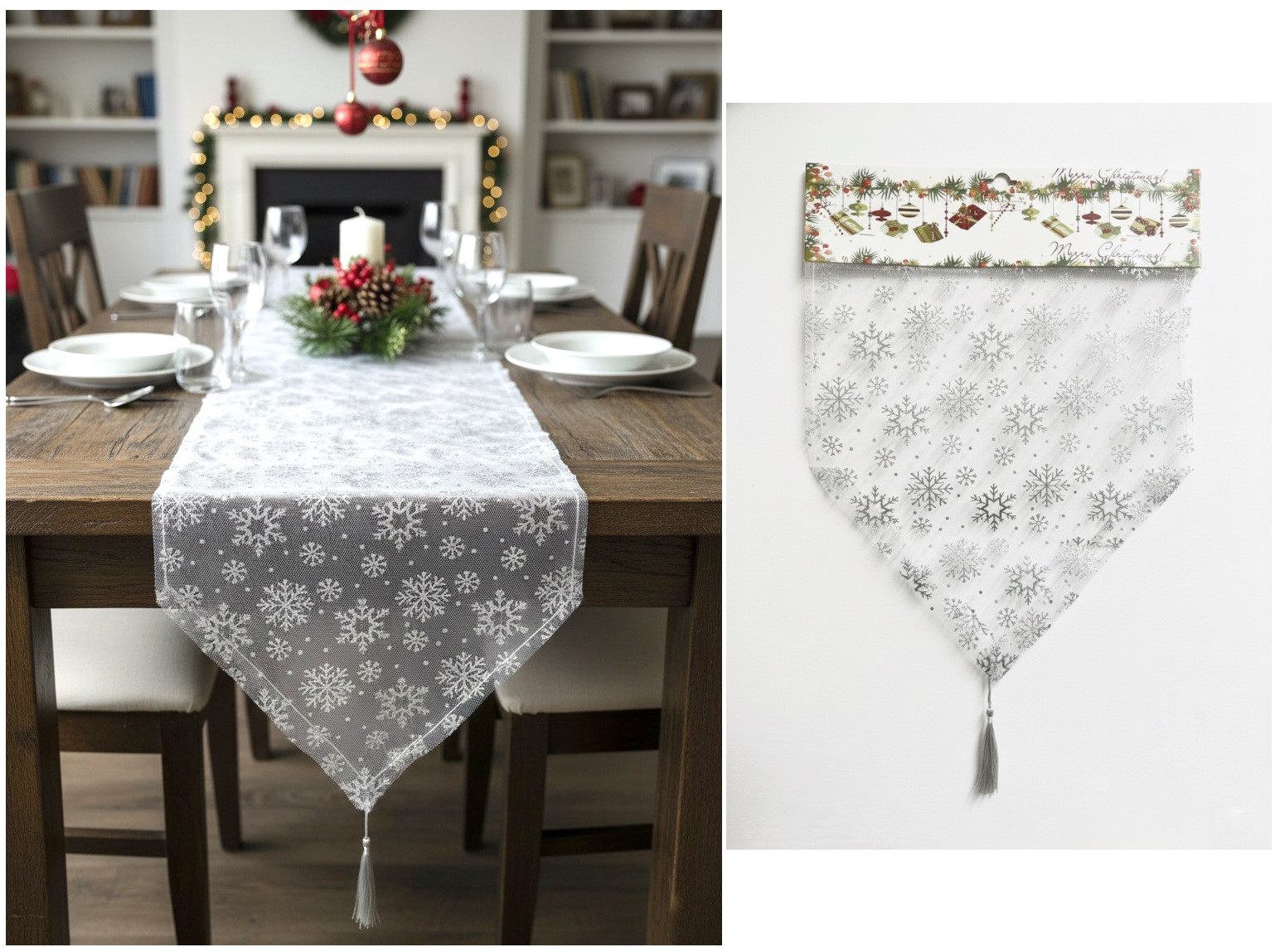 Bieżnik, szarfa na stół świąteczny, bożonarodzeniowy PŁATKI ŚNIEGU 180x35 cm SREBRNY