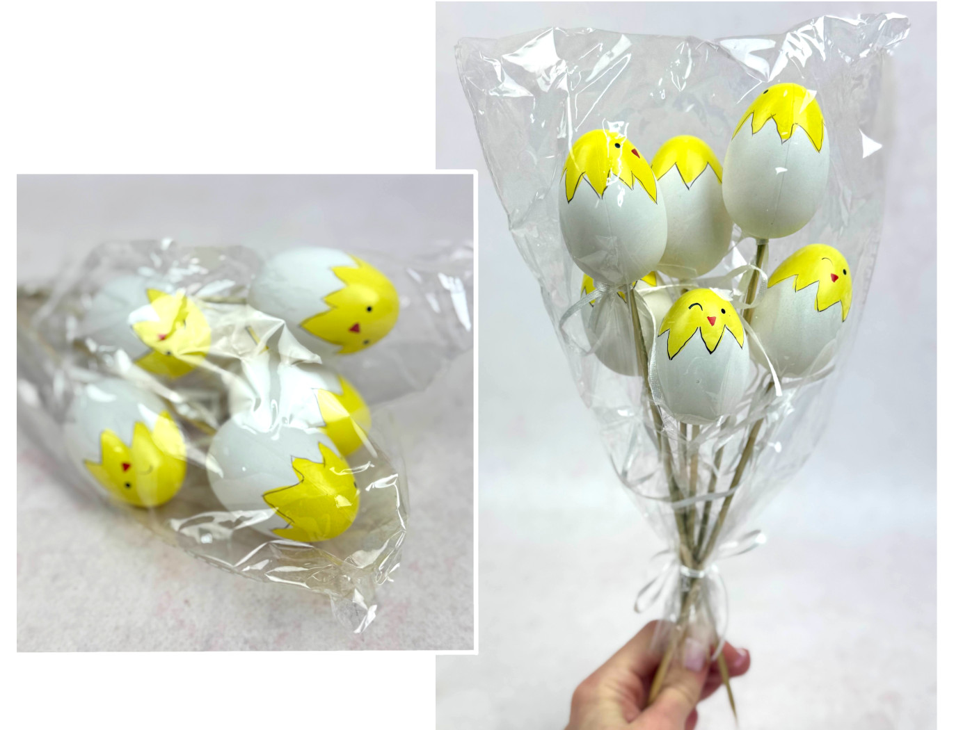 Jajko plastikowe (6 cm) na piku 20 cm biało-żółte pisanka - kpl 6 szt