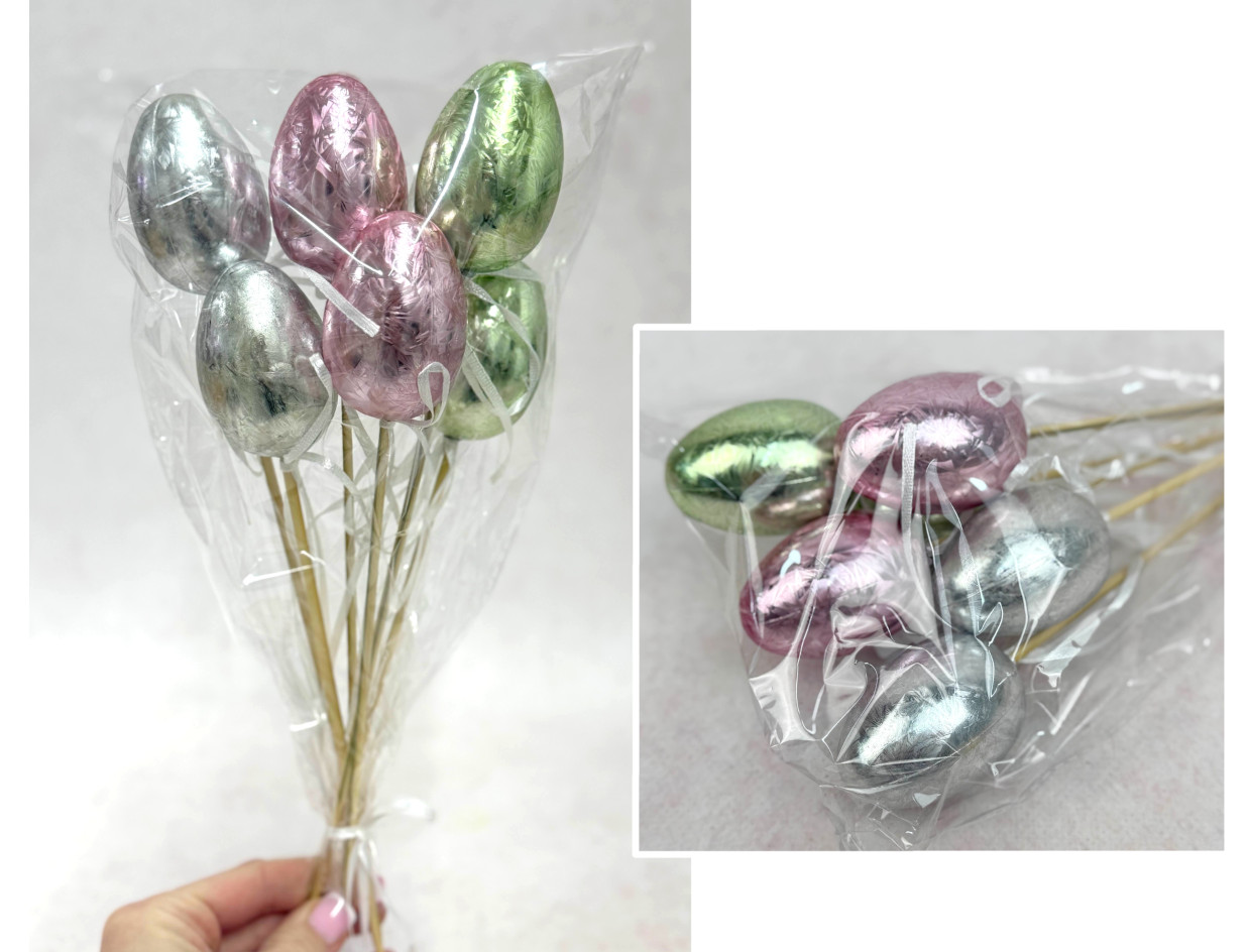 Jajko plastikowe (6 cm) na piku 20 cm metalizowane - kpl 6 szt