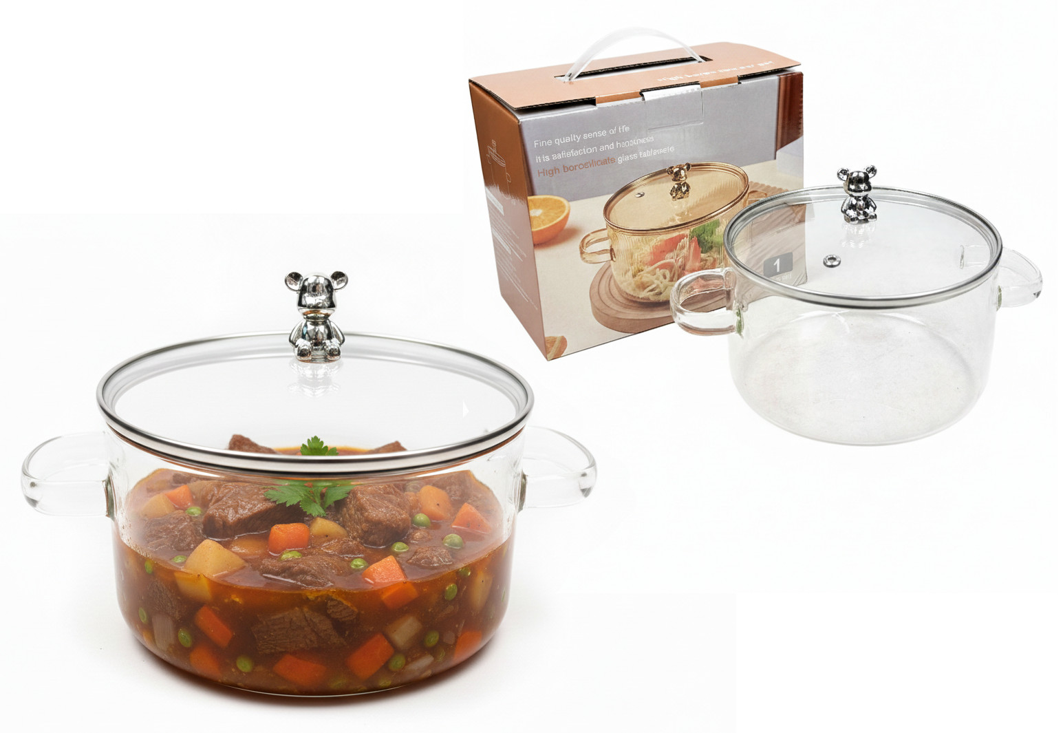 Garnek transparentny z pokrywką z uchwytem w kształcie misia szkło borokrzemowe