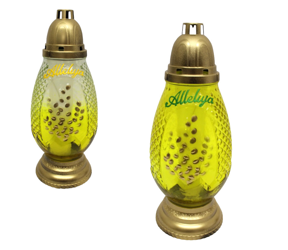 Znicz szklany Jajko 230 Bazie Alleluja zielony, żółty napis 36 cm - 1 szt
