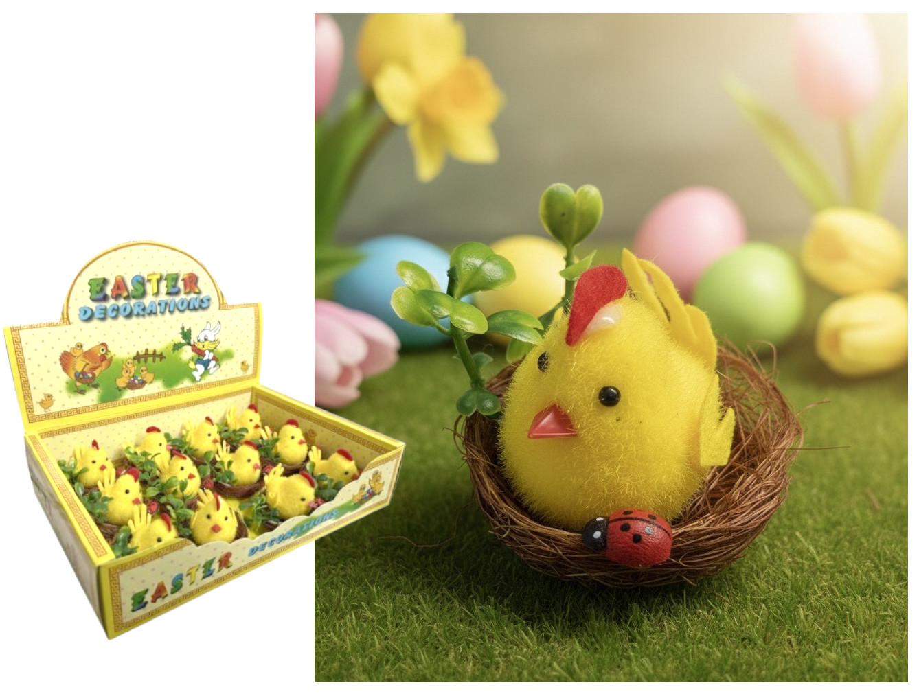 Kurczaki wielkanocne w gnieździe z kwiatkami, pisankami 5x5 cm - 1 szt