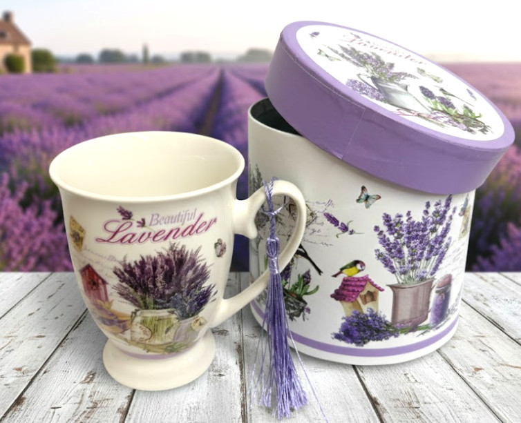 Kubek ceramiczny w okrągłym pudełku 12x12 cm LAWENDA 11x8,5 cm 300 ml