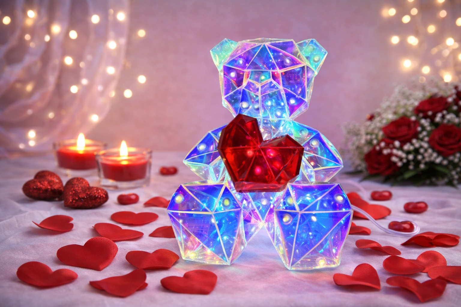 Miś, niedźwiadek 17 cm LED USB, baterie w pudełku TRANSPARENTNY holograficzny z CZERWONYM SERCEM