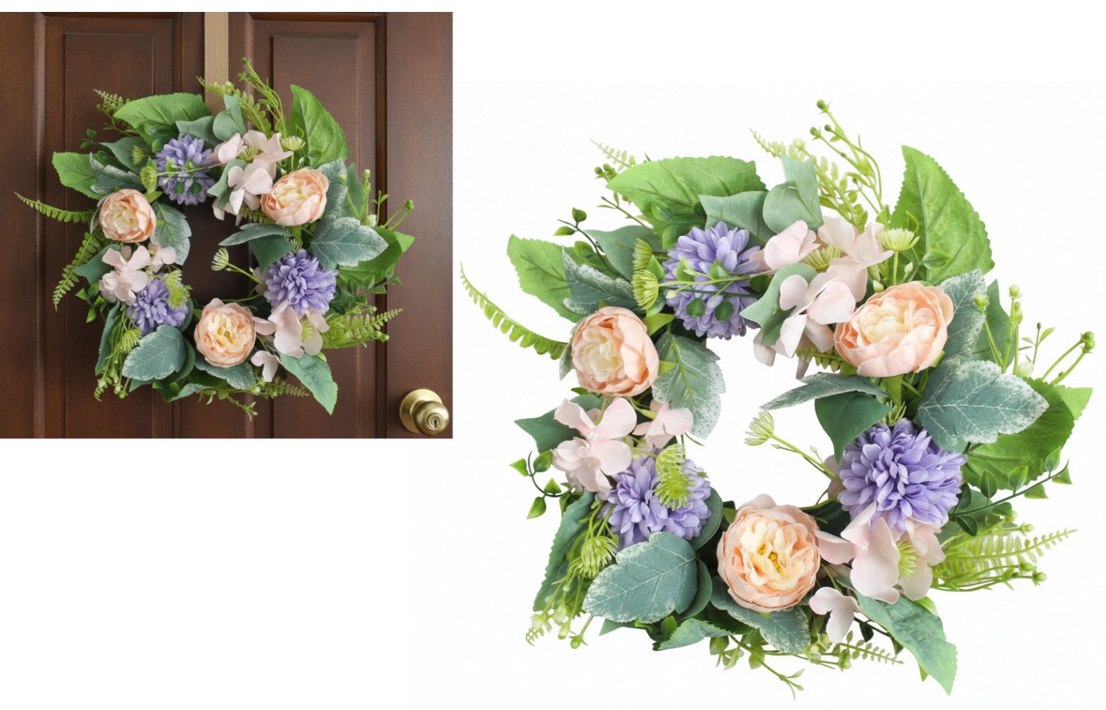 Wieniec wianek RÓŻA, KAMELIA 32 cm (3 róże 9x5 cm, 9 kamelia 5x2,5 cm) - BRZOSKWINIOWO-FIOLETOWY