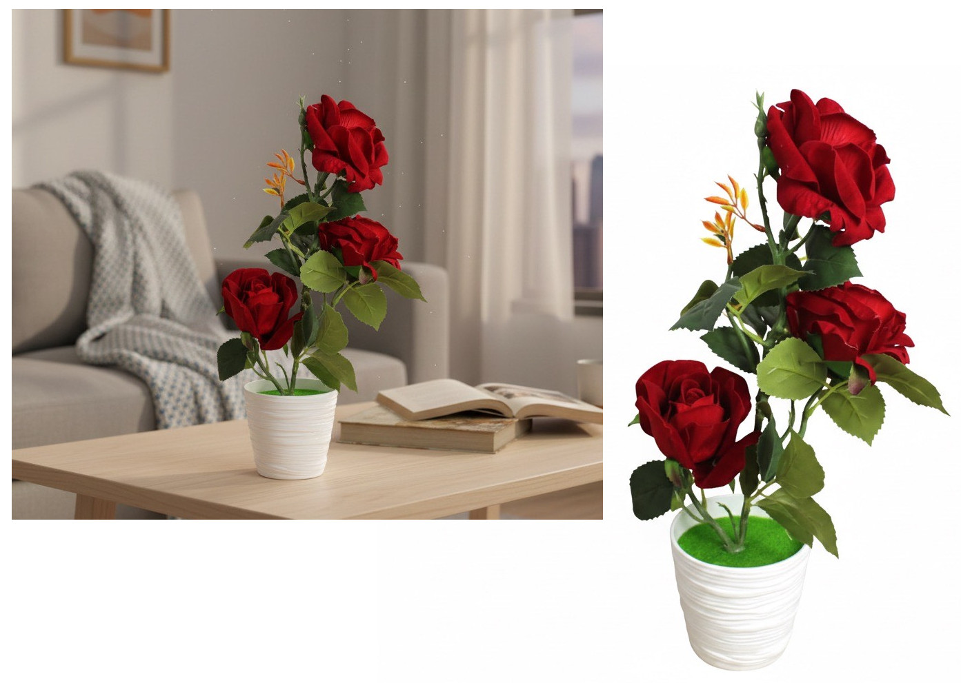 Kwiat RÓŻA w plastikowej doniczce wys. 38 cm (3 główki 12 cm) CZERWONA