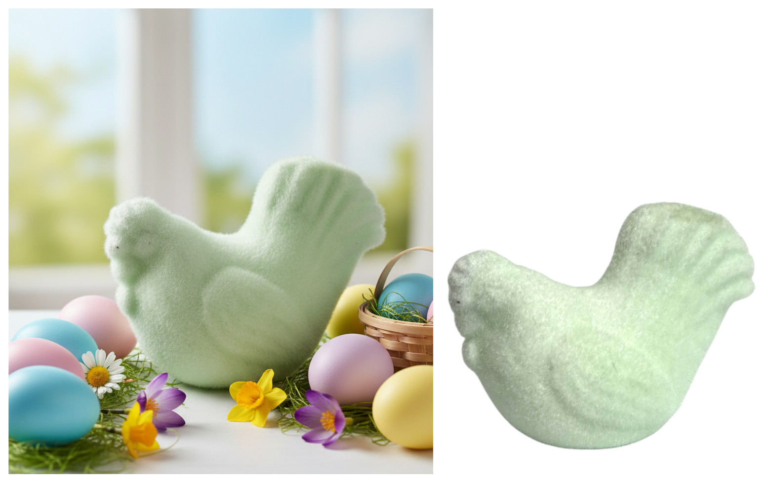 Dekoracja wielkanocna styropianowa KURA flokowana 15x11x9 cm JASNO ZIELONA