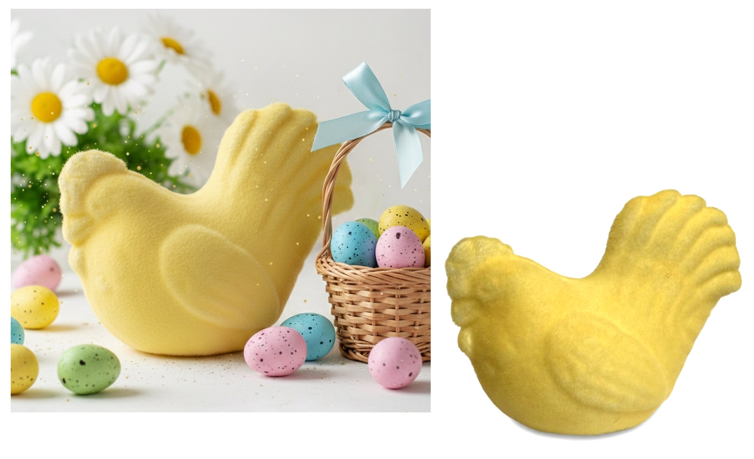 Dekoracja wielkanocna styropianowa KURA flokowana 17x14x7 cm ŻÓŁTA