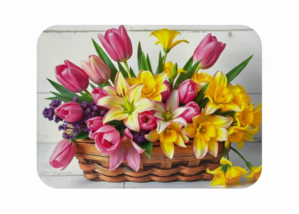 Mata stołowa 40x30 cm BUKIET TULIPANY, LILIE, ŻONKILE W BRĄZOWYM KOSZU