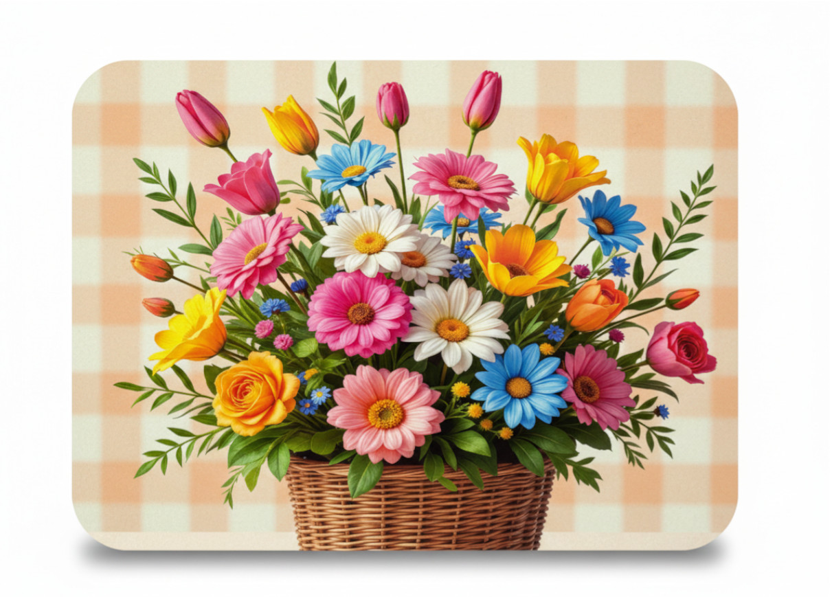 Mata stołowa 40x30 cm BUKIET TULIPAN, GERBERA W KOSZU NA ŁOSOSIOWYM TLE W KRATĘ