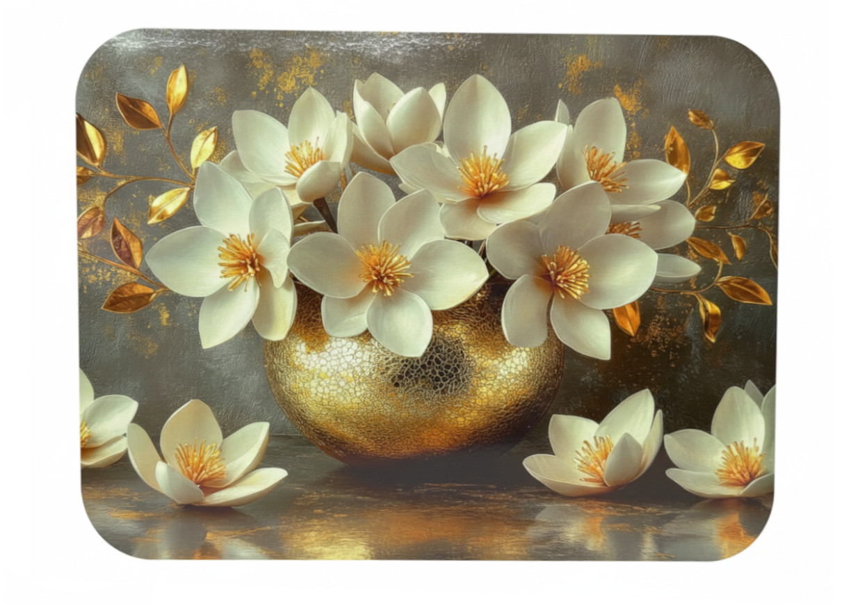 Mata stołowa 40x30 cm BUKIET BIAŁO-ZŁOTYCH MAGNOLII W ZŁOTYM WAZONIE