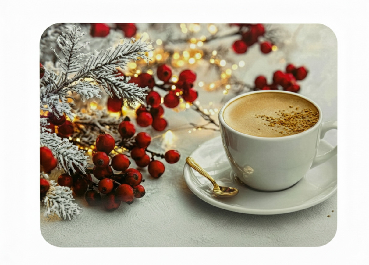 Mata stołowa 40x30 cm KAWA W FILIŻANCE ZE ZŁOTĄ ŁYŻECZKĄ, CZERWONE KULKI