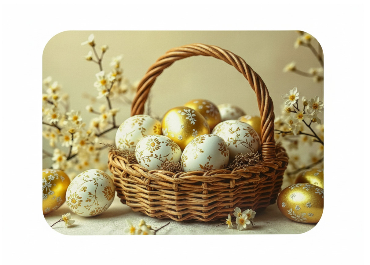 Mata stołowa 40x30 cm PISANKI BIAŁO-ZŁOTE W KOSZYCZKU WIKLINOWYM
