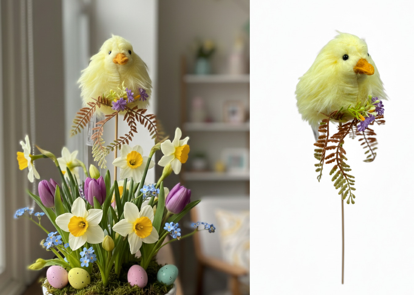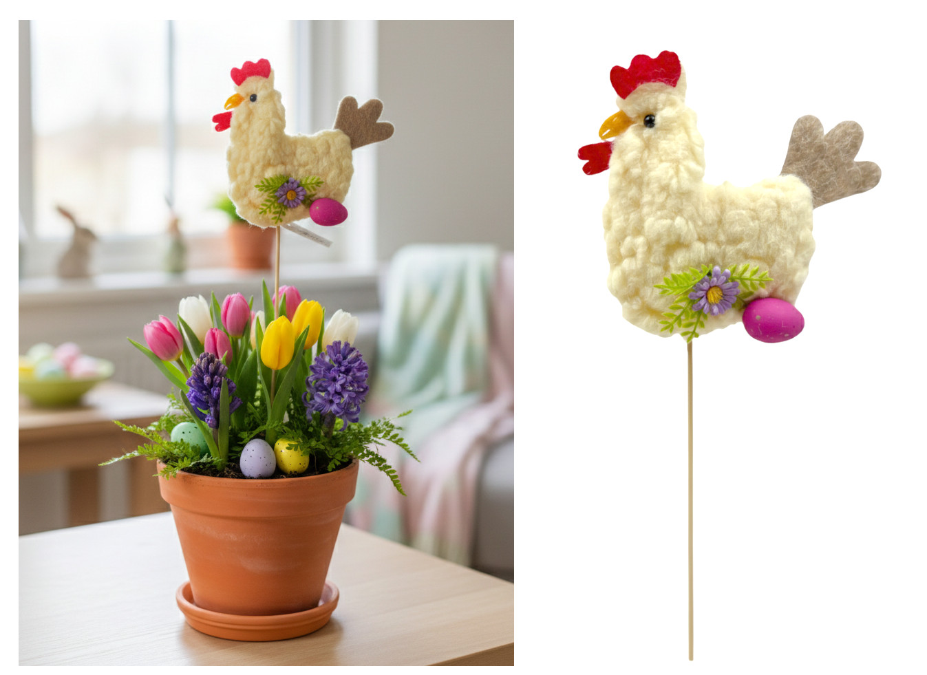 Dekoracja wielkanocna KURCZAK z kwiatkami na piku 34x12x6 cm