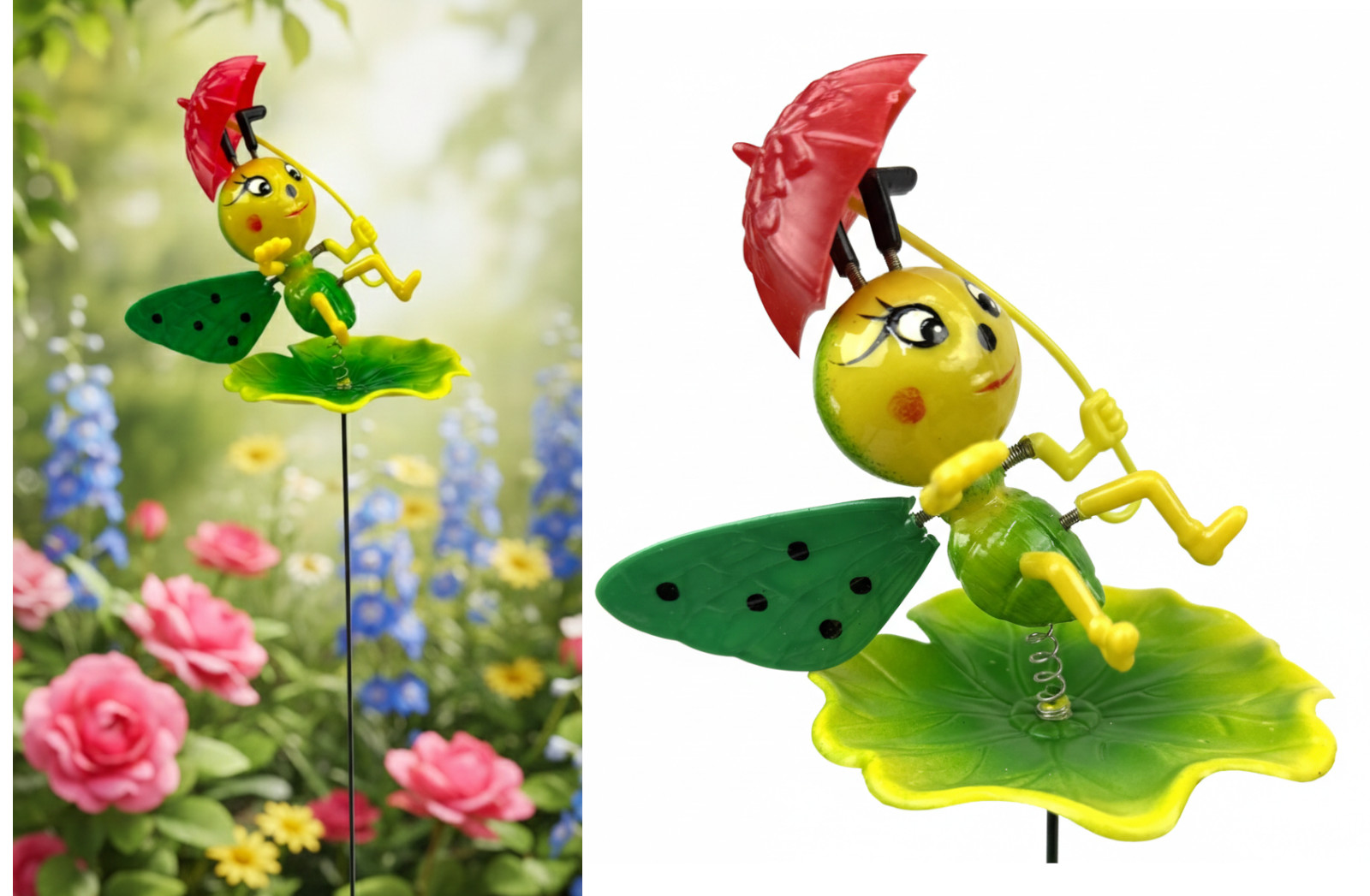Ozdoba plastikowa BIEDRONKA z parasolką na metalowym PIKU 12x12 cm pik 45 cm