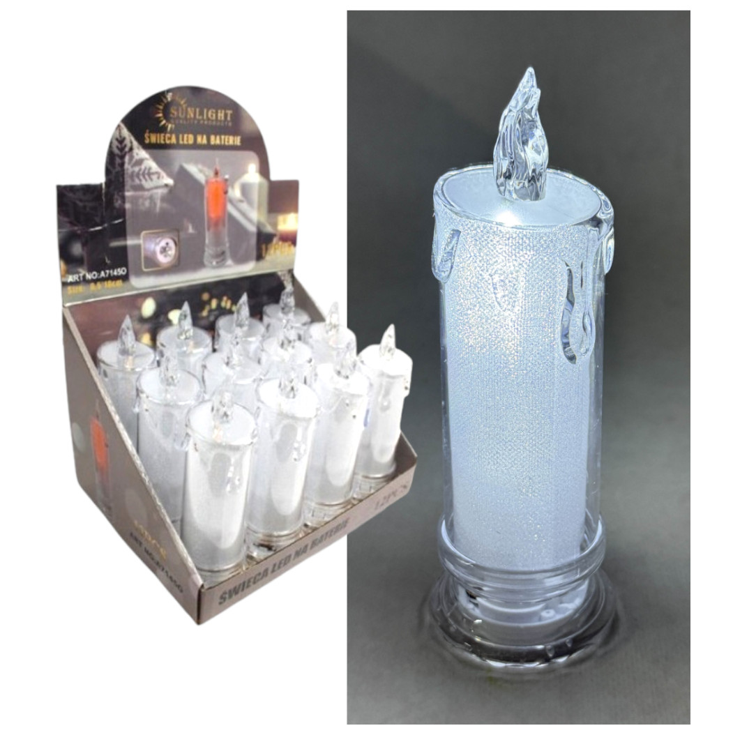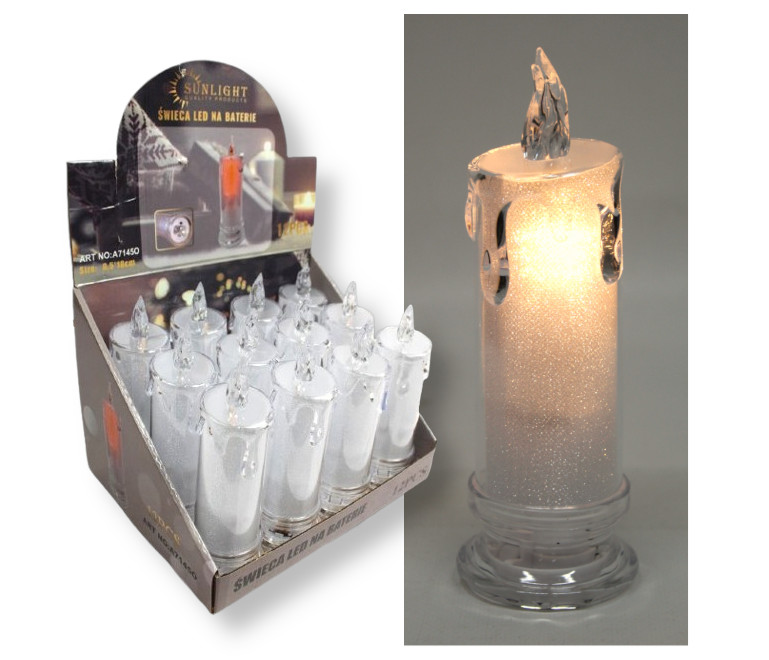 Świeca, świeczka brokatowa LED z podstawą światło (żywy płomień) zimne 18x6,5 cm TRANSPARENTNA A7145W